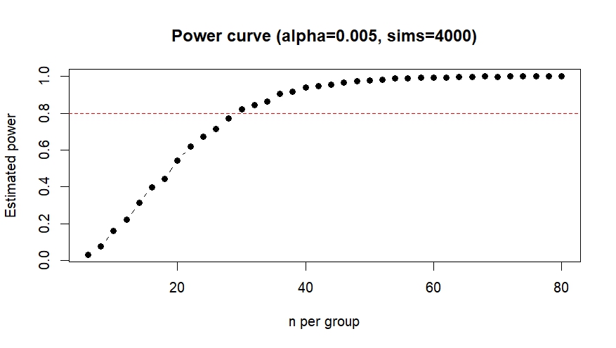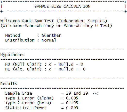 I used the power.np.wilcoxon() function from the pwrss package to calculate the sample size needed to achieve 80% statistical power with an alpha level of 0.005.