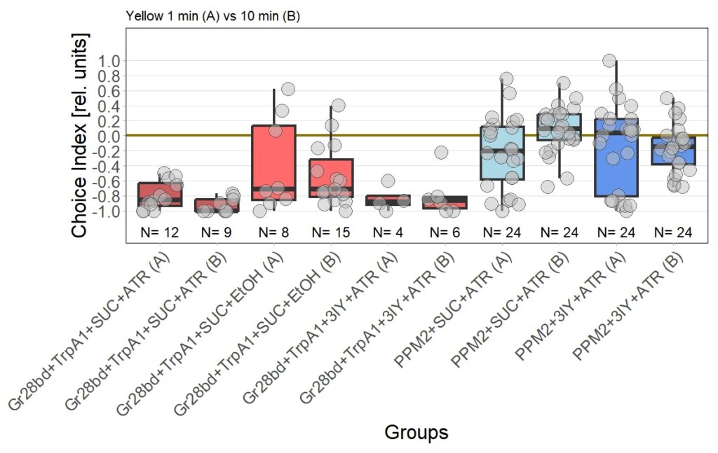 I am currently still performing T-Maze experiment with red light, to check for dopamine dependency of the effect I observed in the original 1 vs. 10 minute T-Maze experiments using yellow light and PPM2 flies.