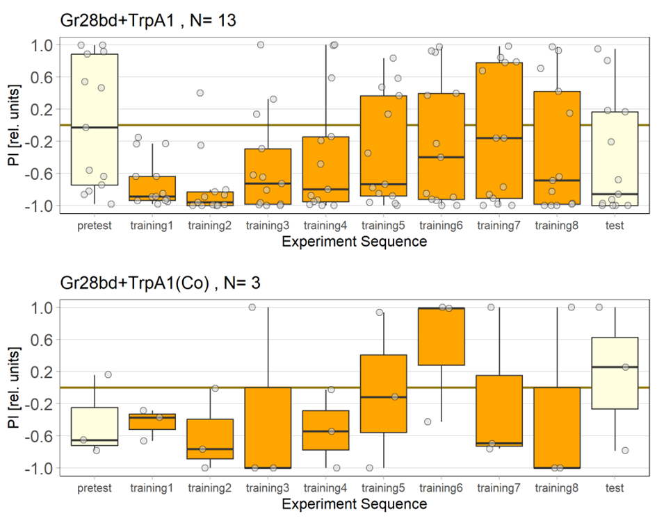 These are the results of the first four days of testing. All in all, the positive control shows good avoidance. Althoug, there is a remarkable change in the error bars starting with the fifth period. Maybe due to exhaustion or any other effect that I don’t know of yet.