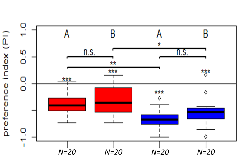 p values: A red light <-> B red light = 0.39366; A blue light <-> B blue light: 0.68727; A red light <-> A blue light: 0.00136; B red light <-> B blue light: 0.02590