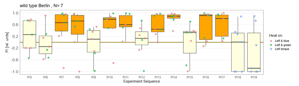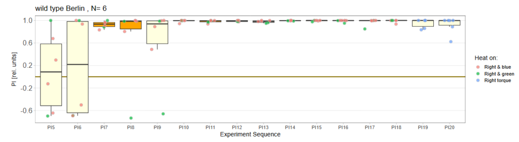 I wanted to try Habit formation with wildtype and tested 4 wheels of flies (48) over the last week. Unfortunately, I did a mistake when setting the timeslots file for right torque so it had an additional testing period at P13. So analyzed the left and right individually: