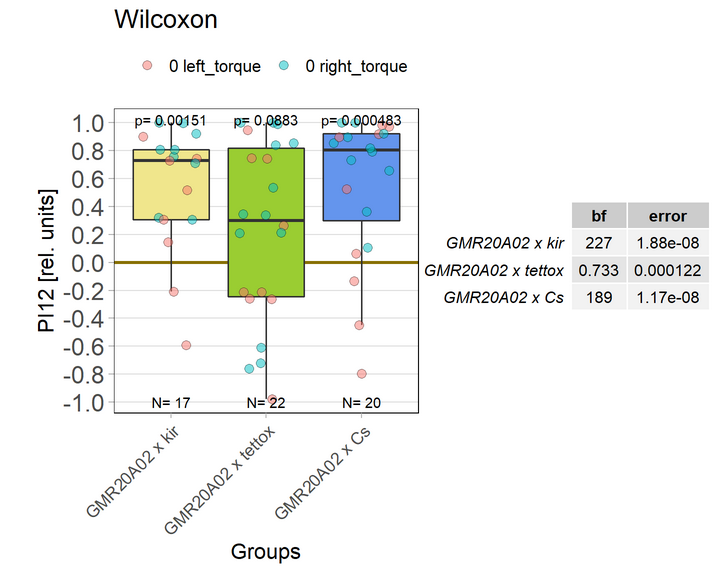 Finally found some time to go through all the individual fly data. All groups lost some flies that had to many or too long flight pauses, strong preferences already before training or some other screw-up during the experiment that I either failed to notice or only showed themselves in this quality control phase. And it was the red group, where I had thought everything just worked so fine, that lost most flies. More than a third of all the flies I had tested in this group failed the very basic quality control criteria – double the number of any other group. This is very annoying as it means there now are a lot more flies for me to test. Nothing to do about that, than to carry on. Here is the result after the massacre, where red lost 10 flies, green lost 5 and purple lost 2: