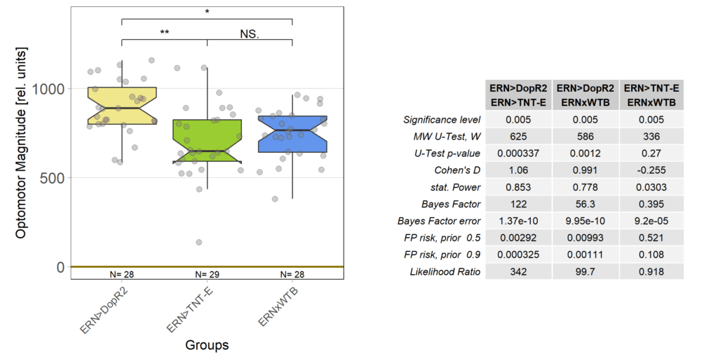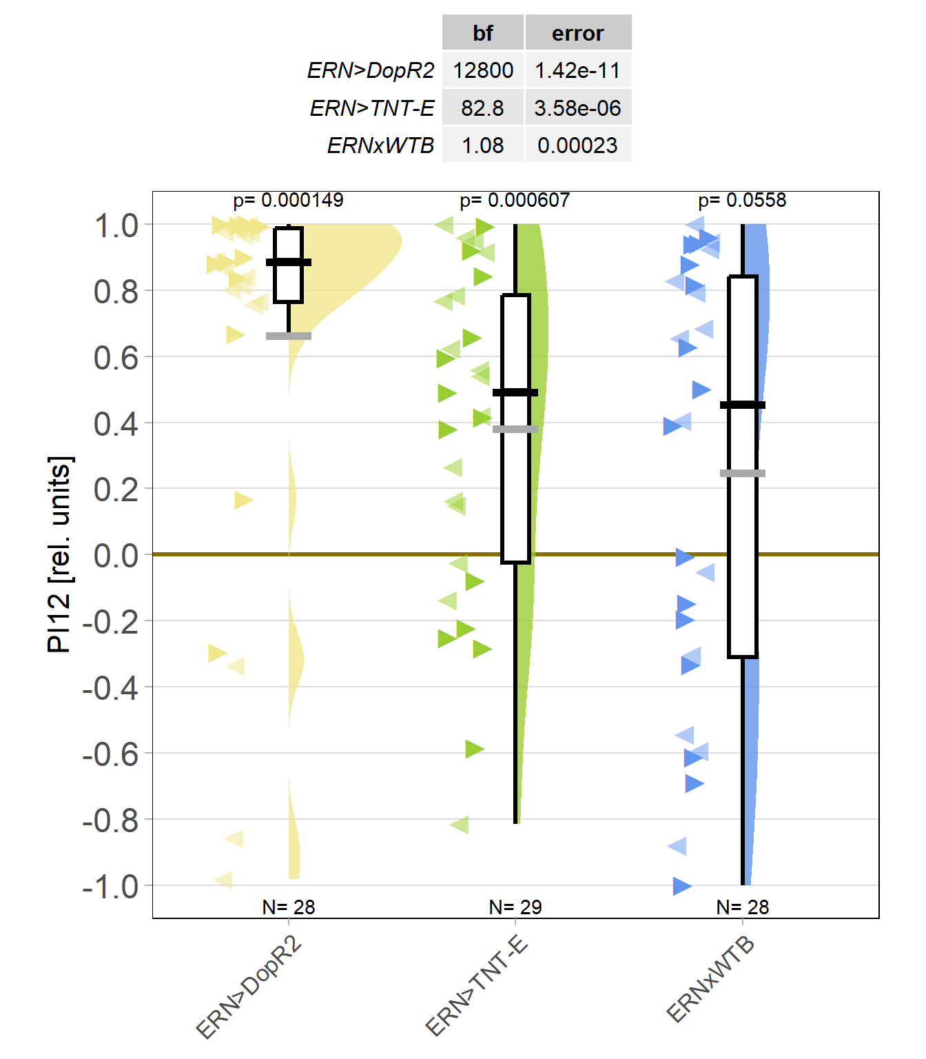 It is unusual for between-groups comparisons to become statistically significant at the 0.005 level with a sample size of less than 50, let alone 30, but these DopR2 knock-downs in ellipsoid body ring neurons are just a class of their own: