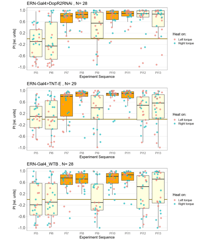 The TNT-E flies had a slight positive preference, worse avoidance (esp. in the first training period) and flew really bad. One could say they did have some learning deficits, but it doesn’t look as if learning was completely abolished (which is roughly what Andreas had found before):