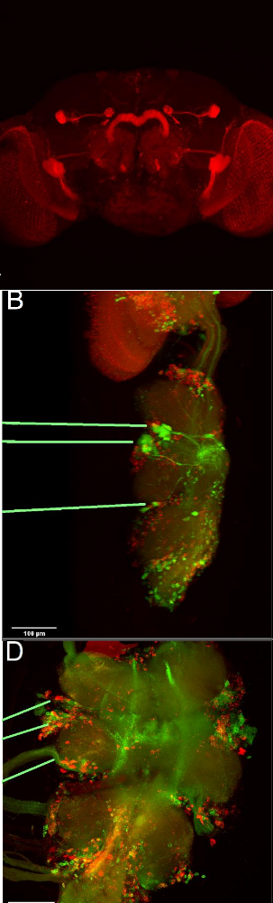 Compairison of the previous shown expression pattern (FoxP: red, D42: green) with the figures from Maniates-Selvin et. al. 2020.