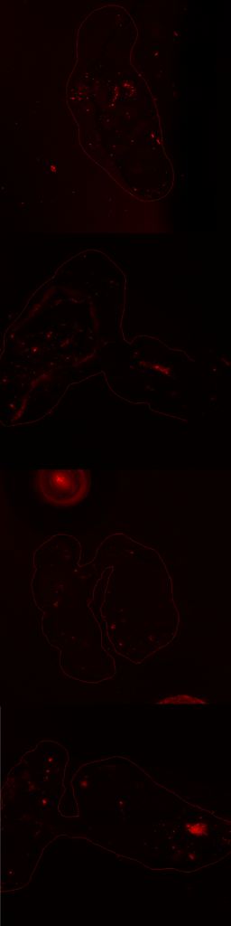 Staining is a bit faint and brain quality a bit sub-optimal and no punctae can be observed in the FoxP channel, decreasing the gain did not resolve this, blocking was done for 1 hour at RT. Perhaps increasing concentration of 1st degree antibodies, especially for RFP might improve the results.