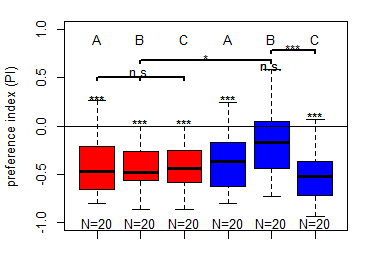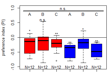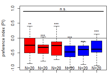 Salt (1.5 M) avoidance test in DAN-larvae under red and blue light (N=20)