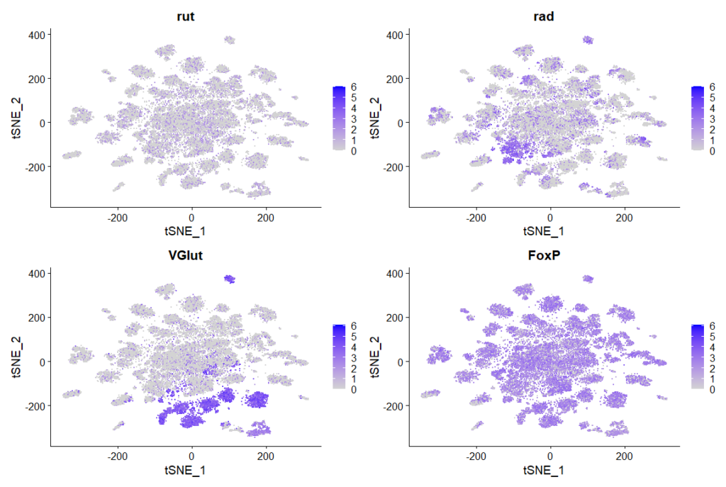 rut, rad, VGlut, FoxP expression in clusters: