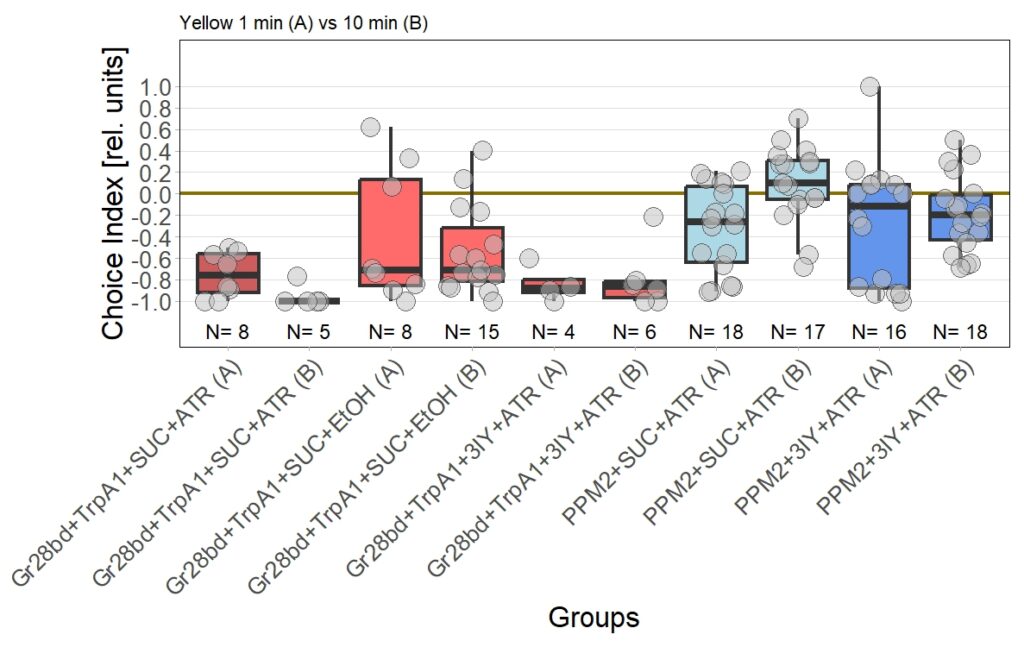 On the other hand, the experimental groups look pretty good. For now, I was not only able to reproduce results from the first 1 vs. 10 minute T-Maze testing with yellow light, it also seems that 3IY-treated PPM2 flies show the same phenotype as when tested in red light.
